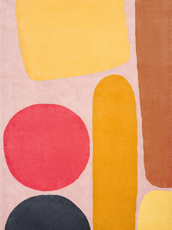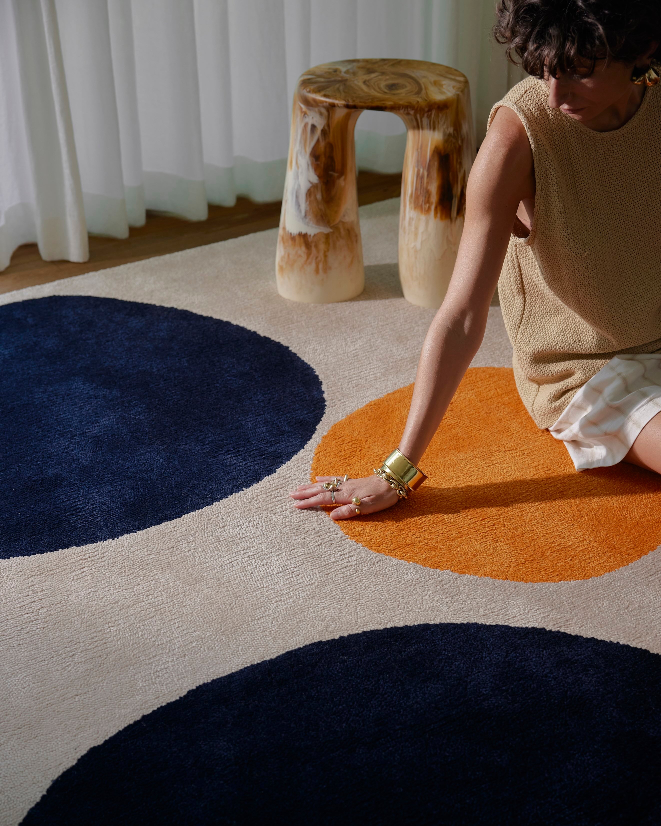 The golden glow of honey and passionfruit with the unexpected touch of charcoal grey creates a beautiful harmony of colors to add a sunny luminescence to any space. The soft tufts of wool, evocative of pollen, add an extra softness to the outline of the shapes.
