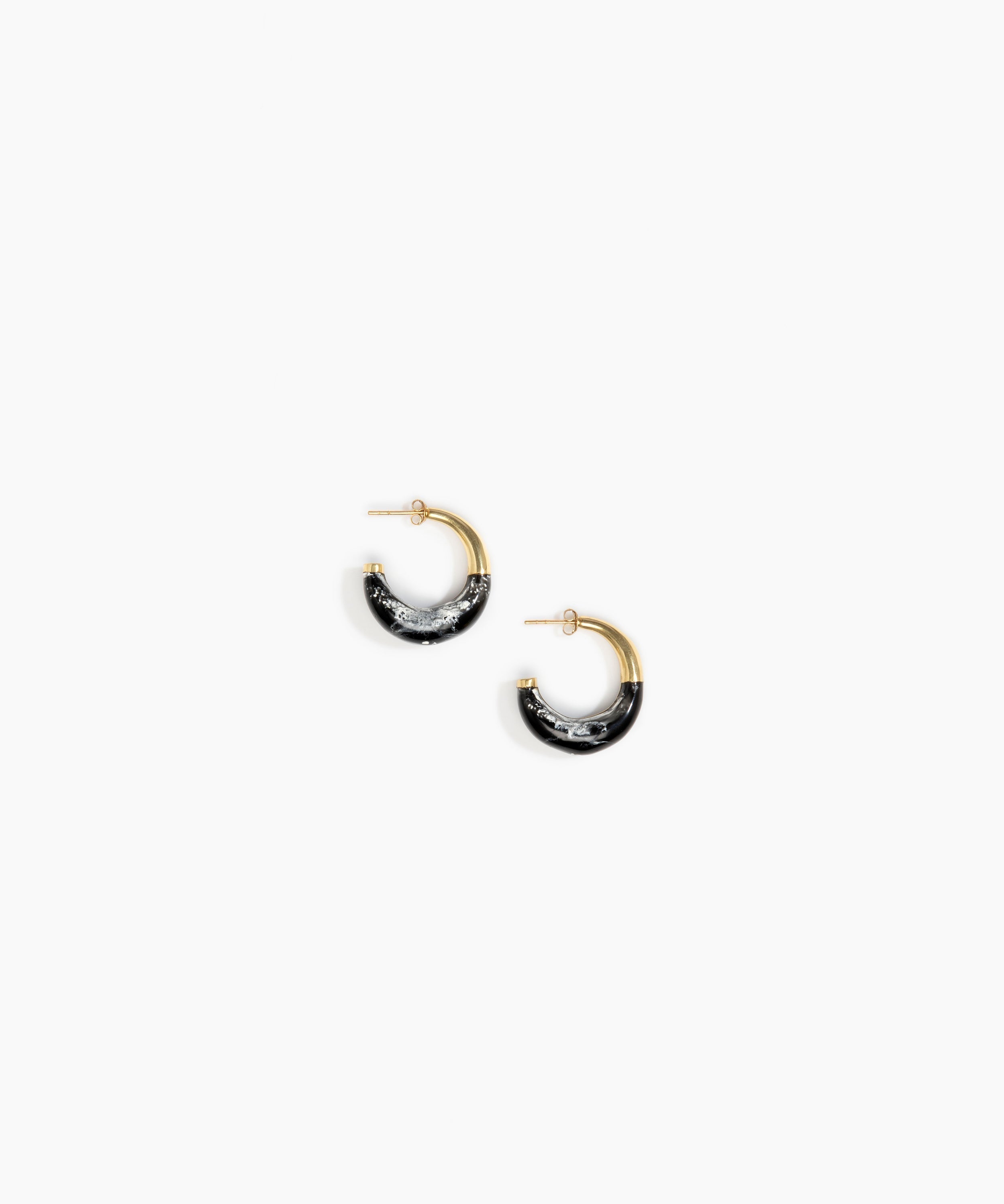 The Small Horn Earrings showcase the endless possibilities of resin by encasing resin swirls in nano-coated brass. The crescent-shaped resin meets with a brass cap at its end and features a gold-plated sterling silver earring post.