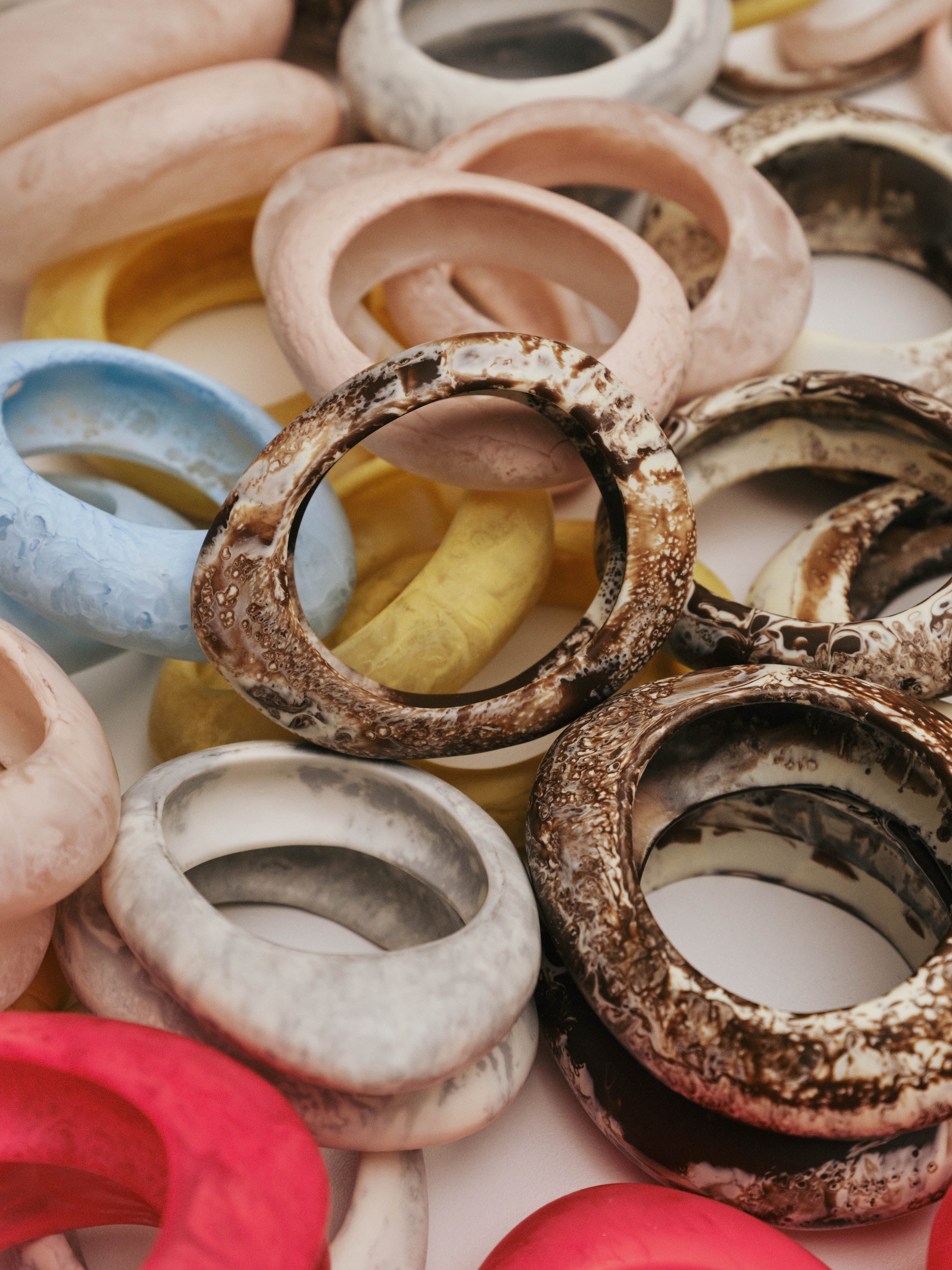 Discover our complete collection of intricately handmade jewellery. Sculptural resin forms are paired against considered metal forms, creating balance between bold, maximal shapes and refined essentials. Cord, leather, metal details thread beaded styles accent the collection.