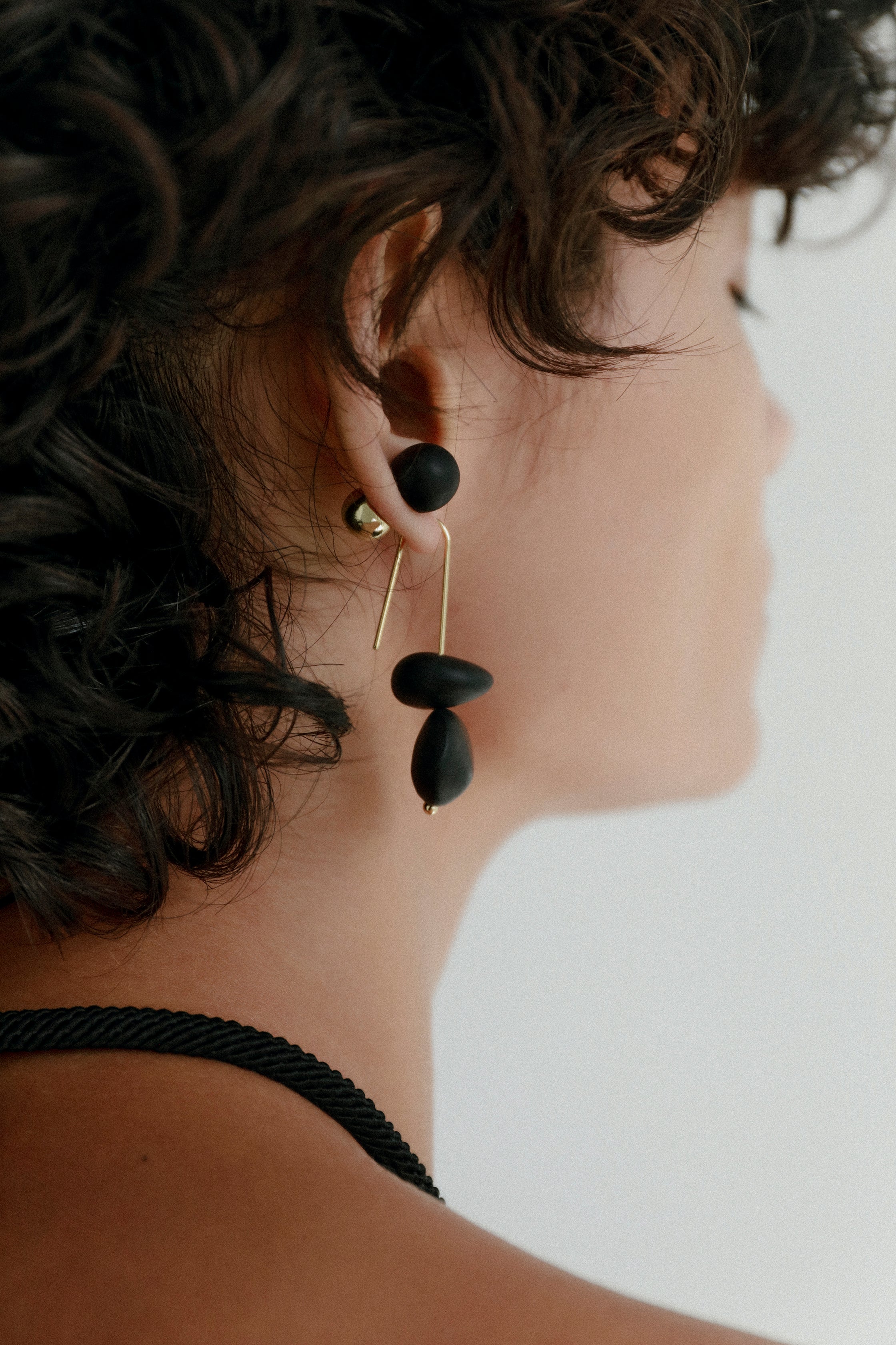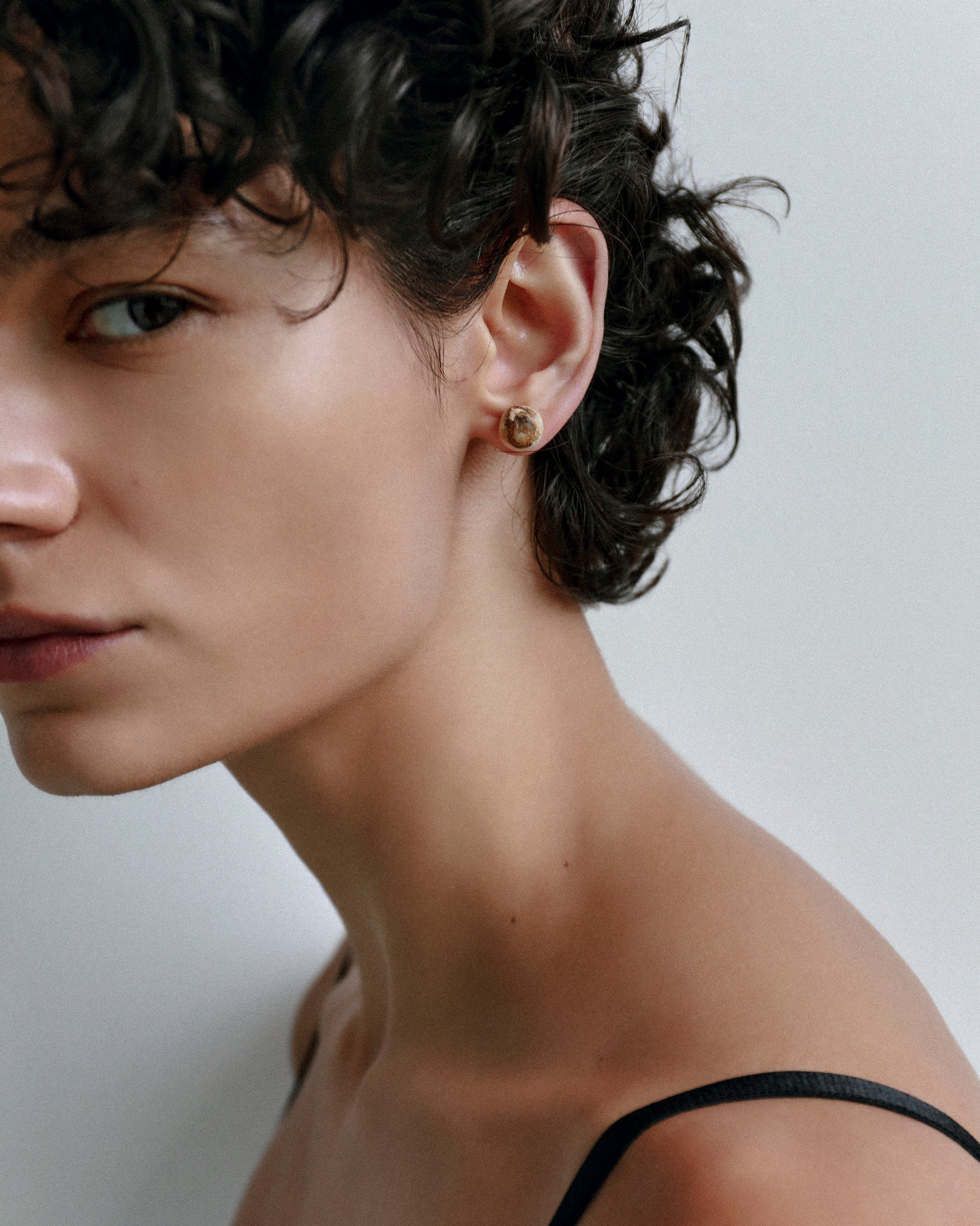 The Small Ball Stud Earrings showcase the endless possibilities of resin, by fusing resin with nano-coated brass or silver-plated brass. The resulting composition is playful, giving the illusion of a floating brass and resin ball either side of the lobe.