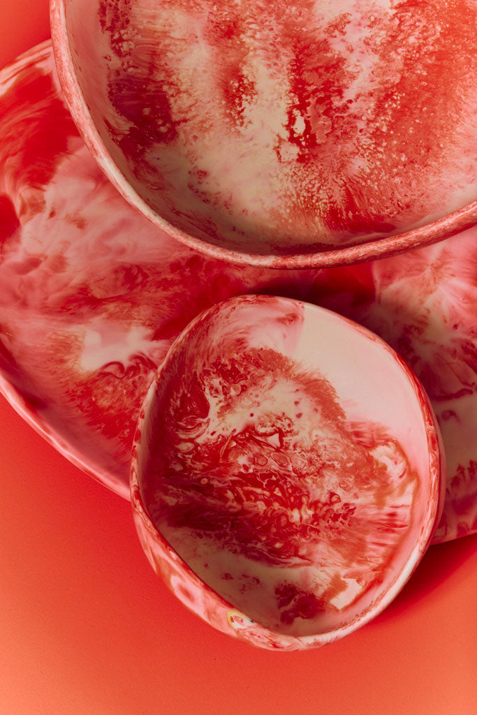 Our homewares are suitable for cold food only. These pieces should be hand washed in warm water. Resin may appear frosted after washing and should be rubbed with a drop of cooking oil to restore sheen. All resin pieces are strong and durable but should be treated like a ceramic and are not shock-absorbent and can break if dropped or knocked against a hard surface. Resin is not fire resistant and so should not be used in an oven, a microwave, or used as candleholders or ashtrays.