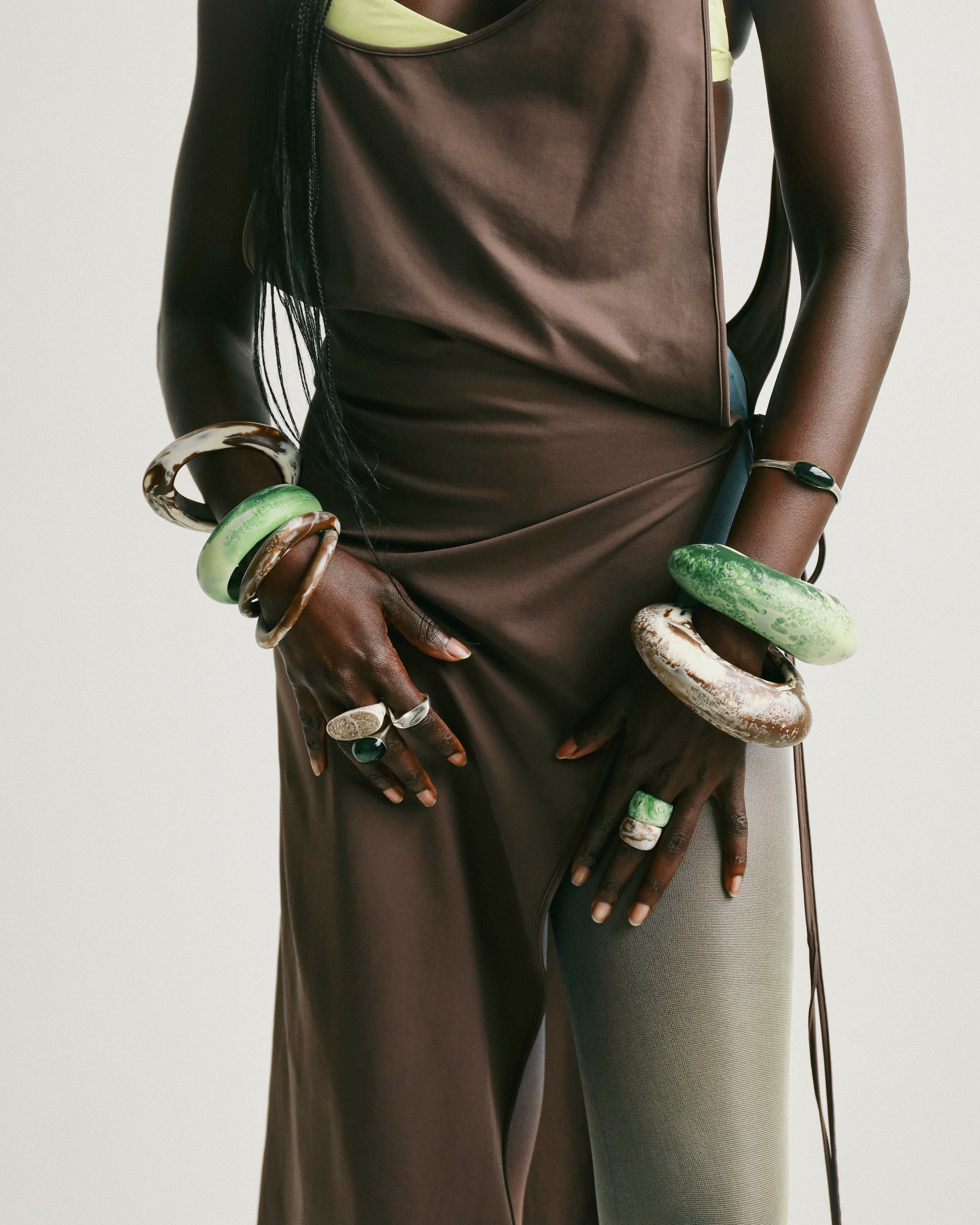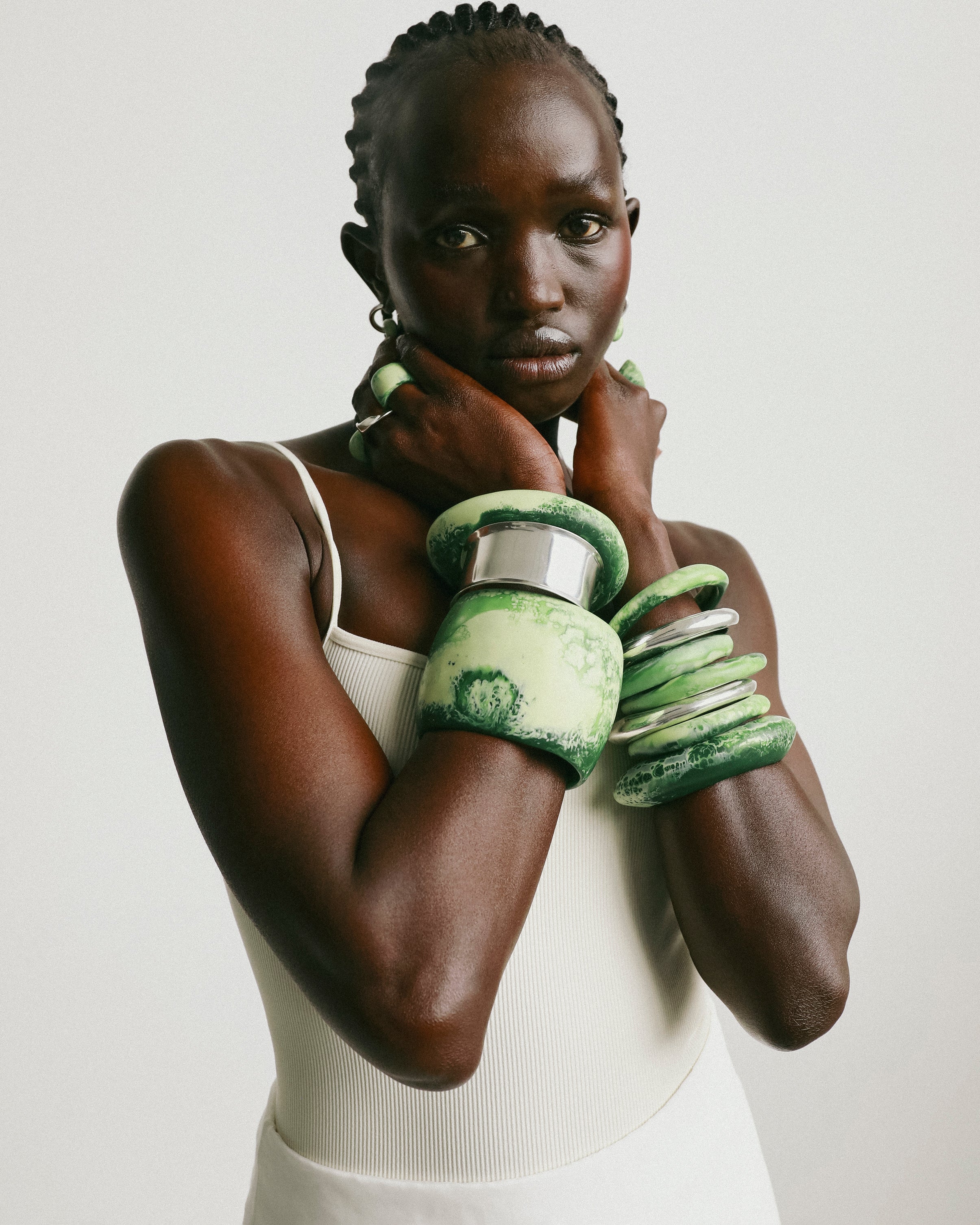 Drawing inspiration from natural rock formations, the Resin Rock Bangle beautifully follows an organic, ovoid form. This style hugs the wrist, and its oval silhouette is intensified when layered.