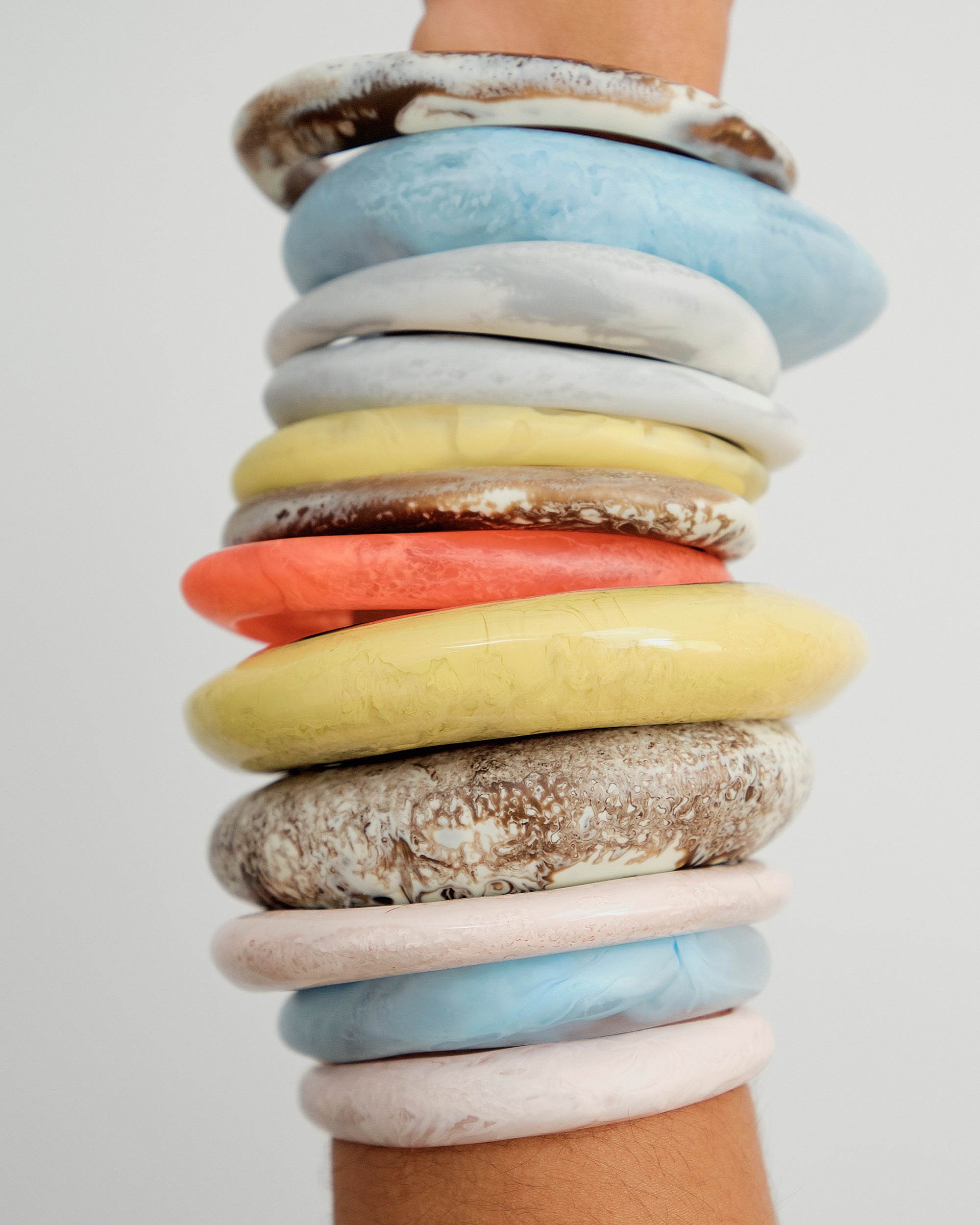 Our collection of resin and metal bangles is defined by organic and irregular silhouettes. Characterised by our seminal wishbone bangles, the collection includes larger, bold styles for the contemporary dresser.