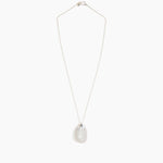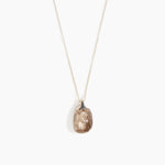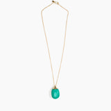The Medium River Rock Pendant showcases vibrant resin swirls fused with nano-coated brass. The brass detail threads a 14k gold-filled chain with a brass DD logo tag at its tail end.