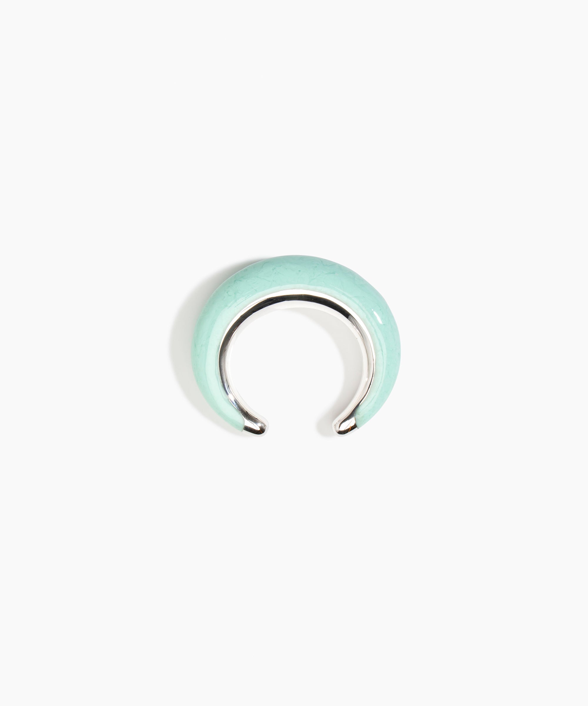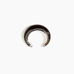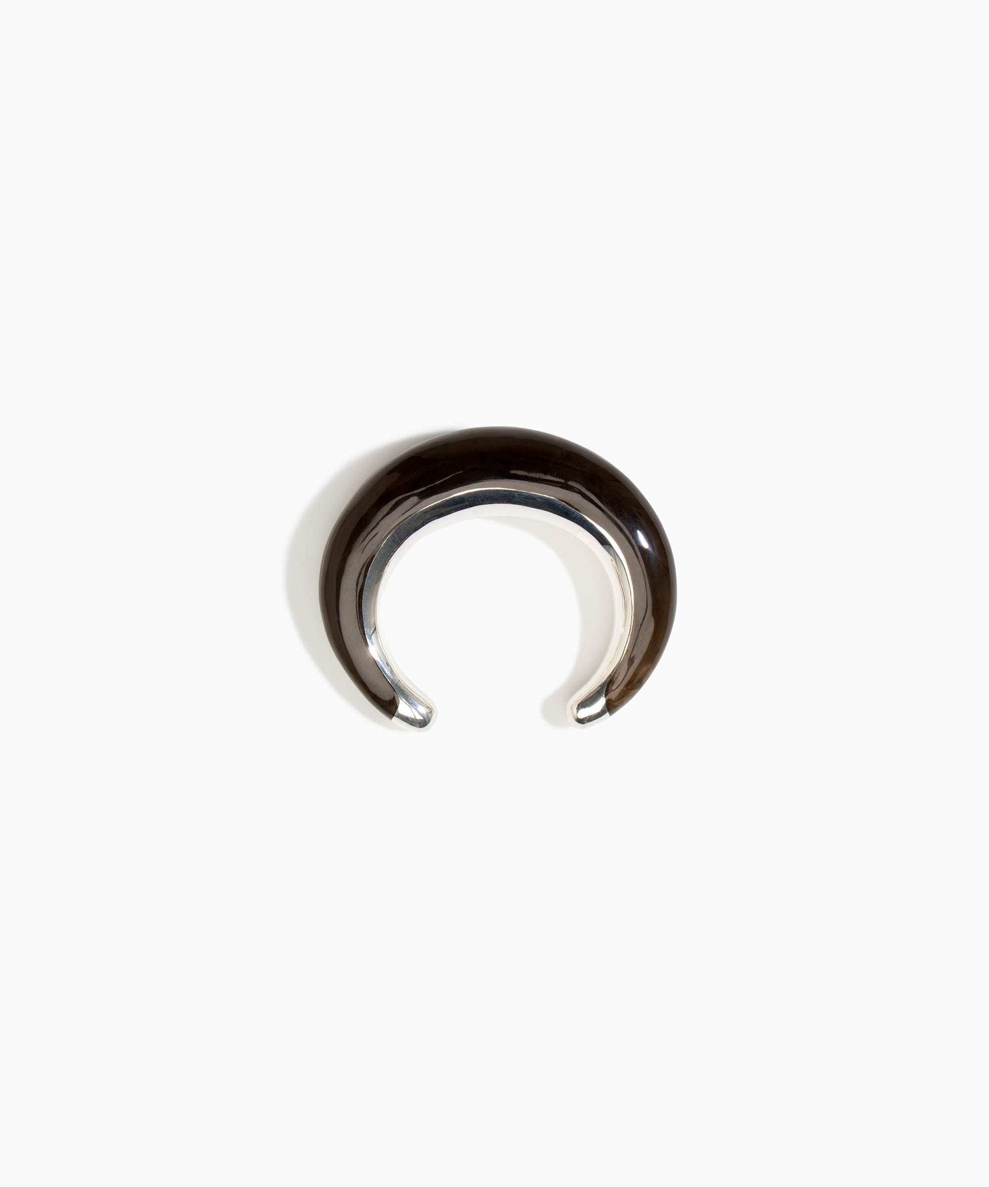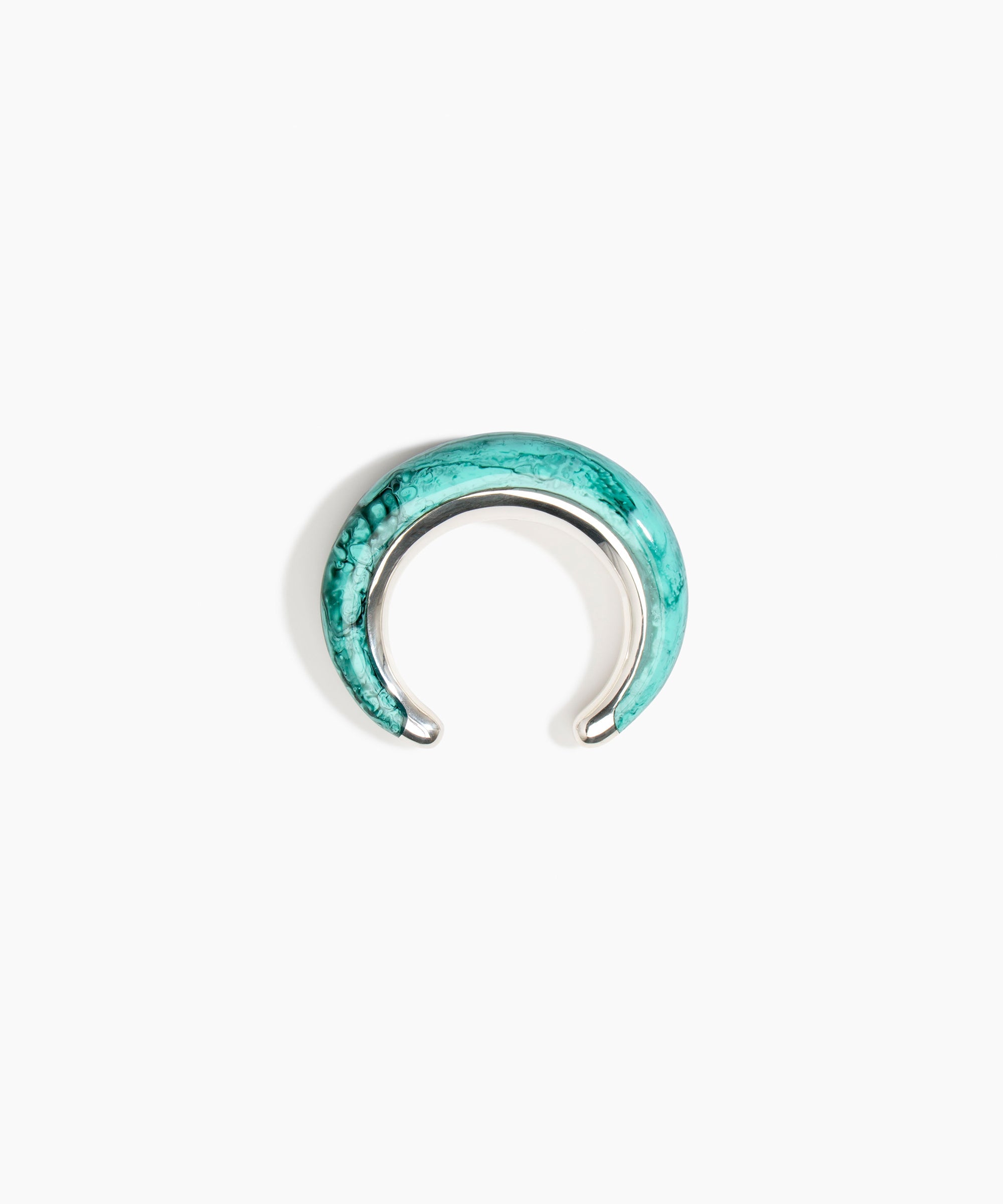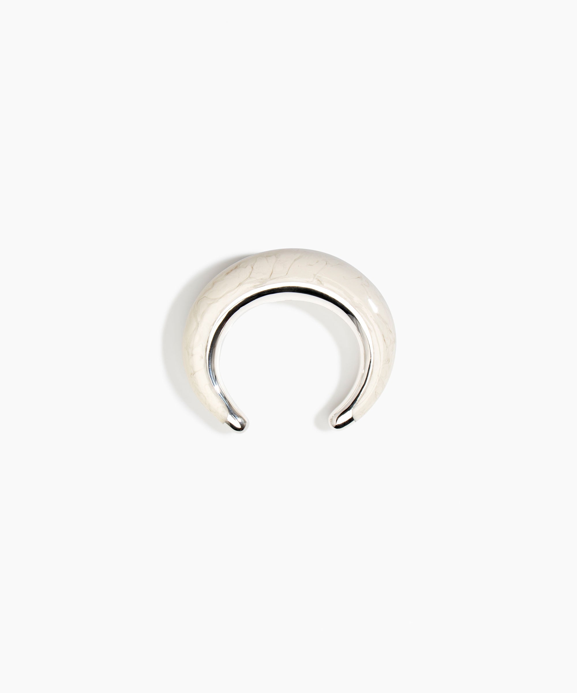 The Crescent Cuffs are open cuff styles that embrace the wrist with a dual finish, effortlessly combining polished resin and metal for a dynamic effect. Each end of the cuff is finished with a metal cap detail. The bold in this style is characterised by a more bulbous form. Available in silver-plated brass.