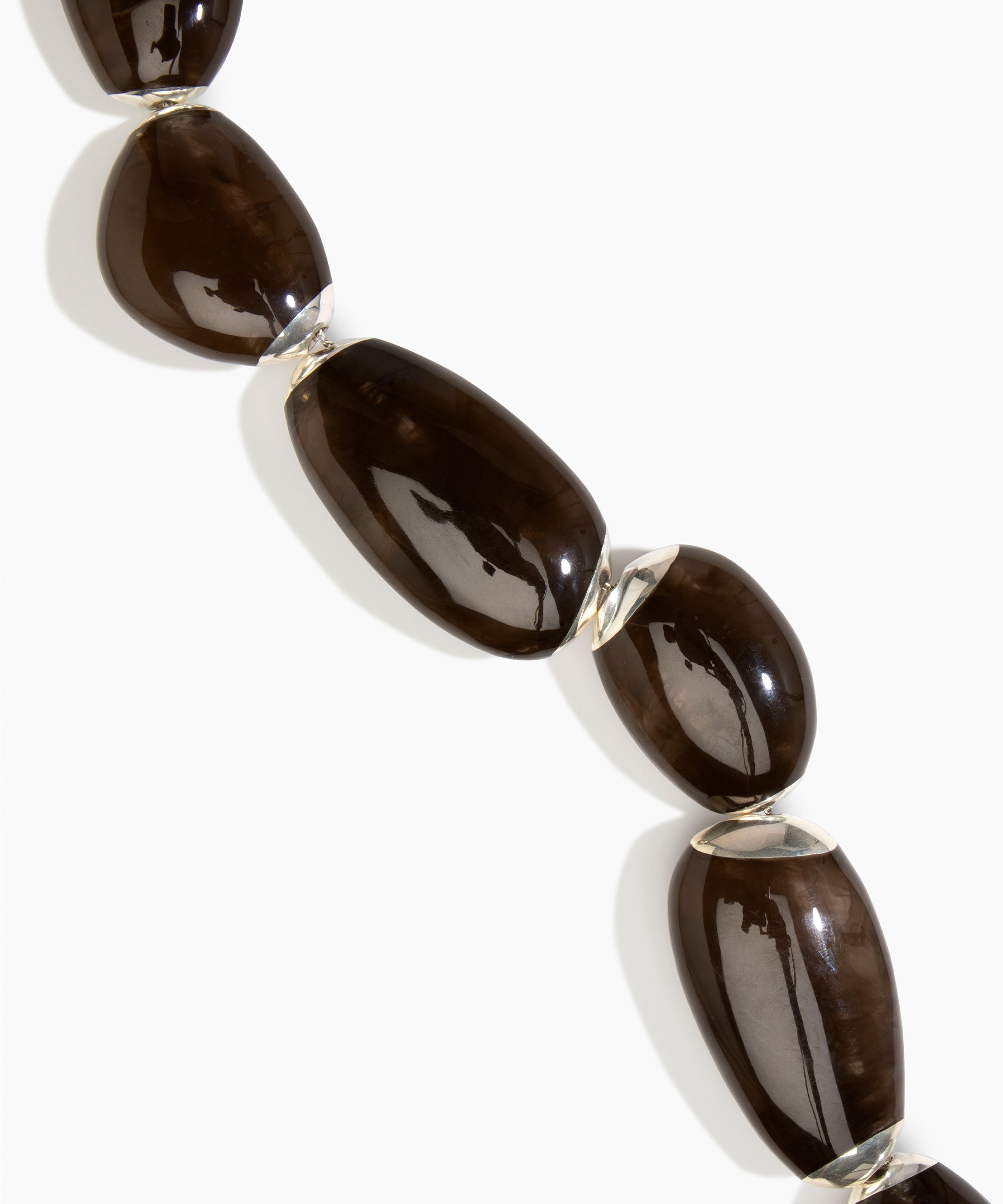 Referencing smooth, geological forms, the Rock Choker skilfully threads large, varied resin beads onto a silver chain, creating a statement necklace style that sits at the collar. Each of resin bead is cast into silver ends, framing the marbled resin for a strong visual effect.