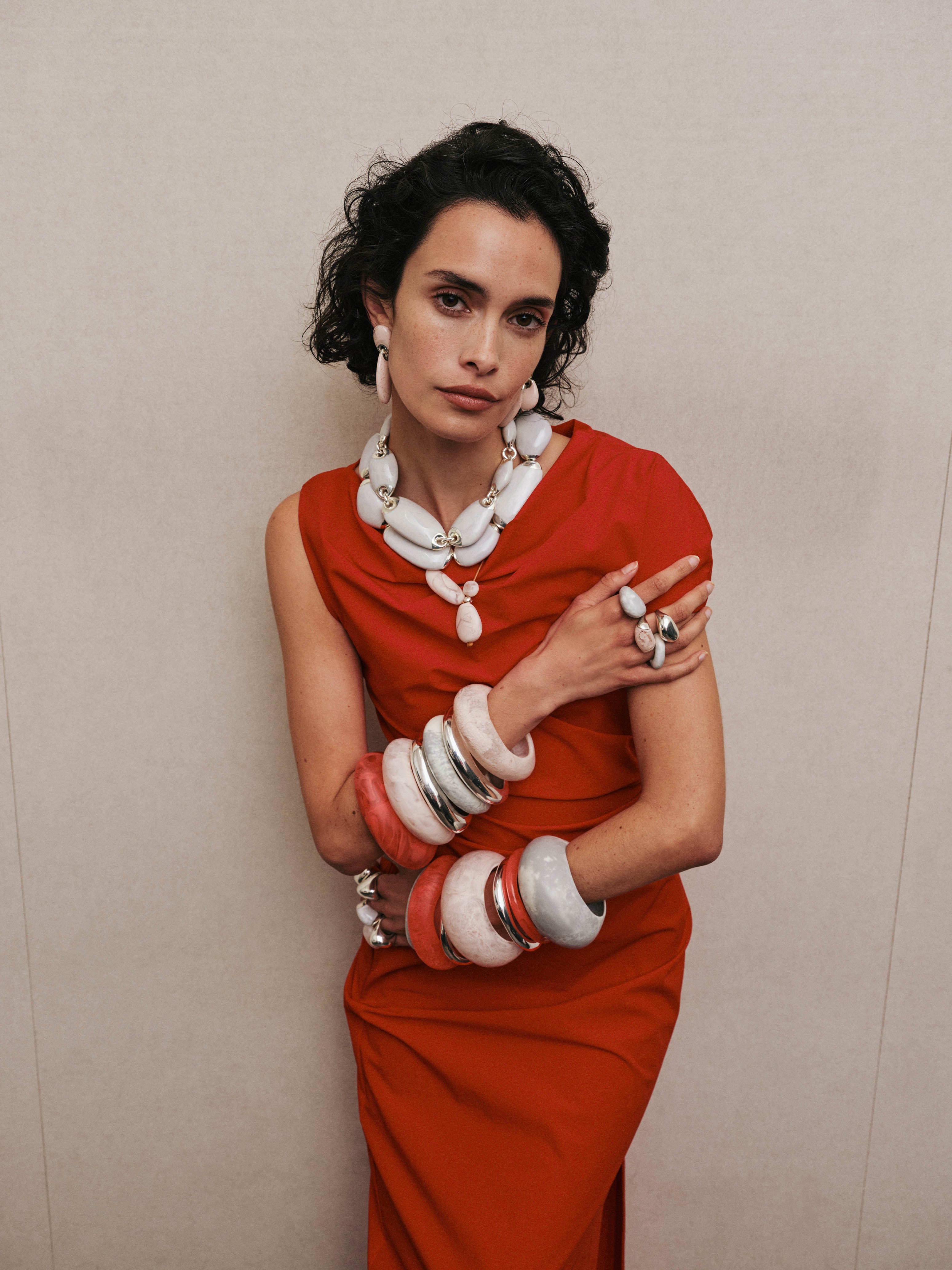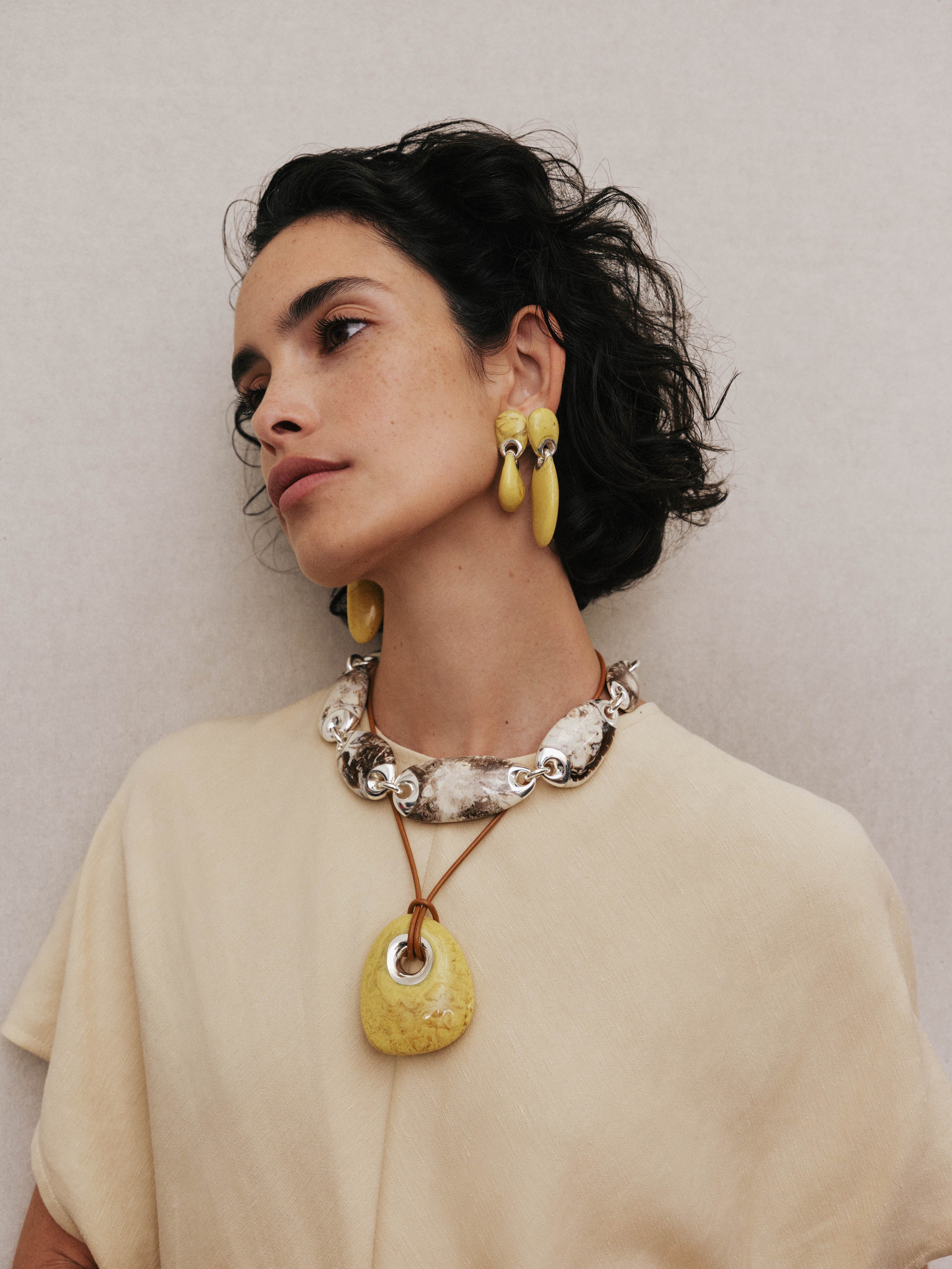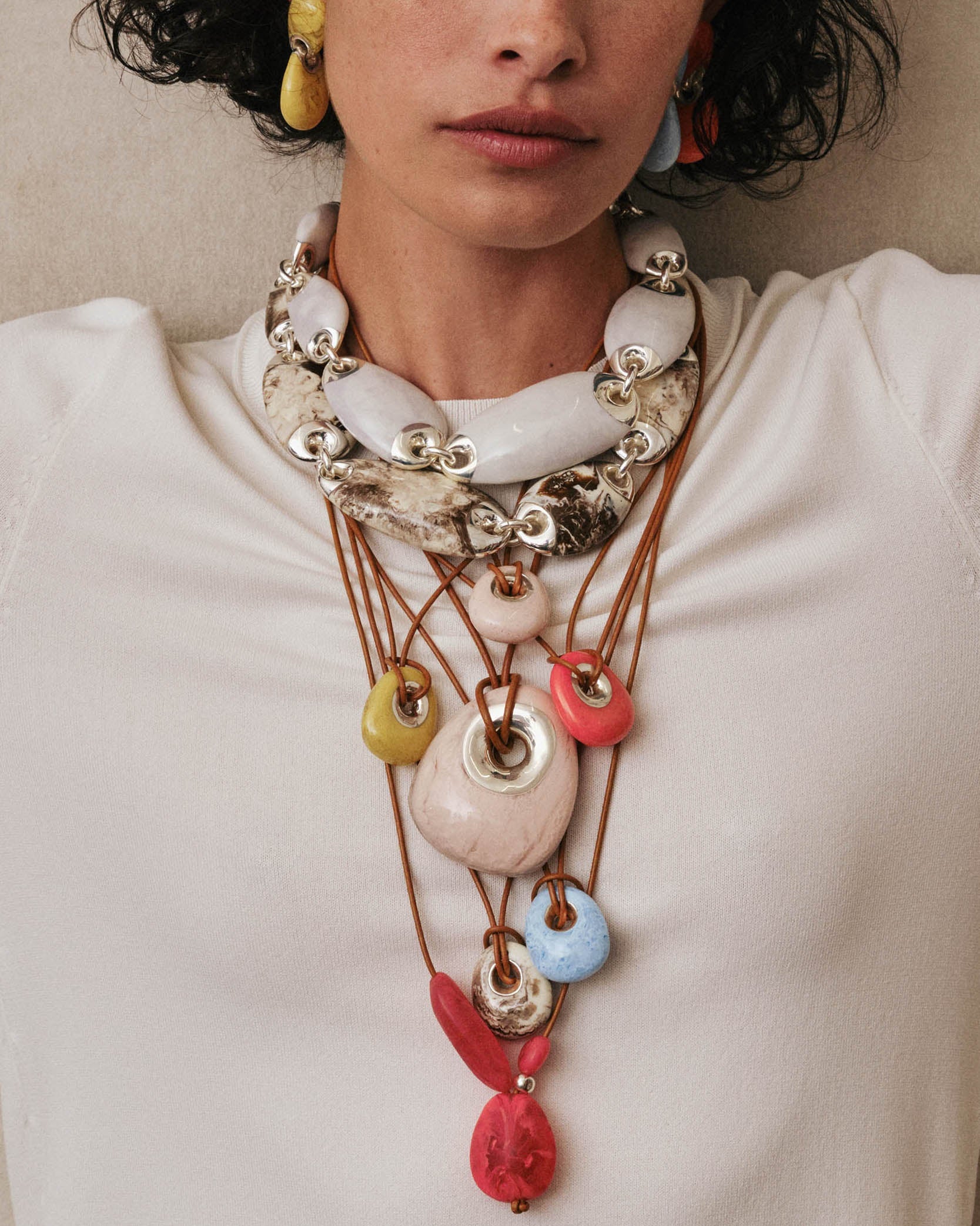 Continuing our studio's heritage in beading, our collection of necklaces predominantly features pendants and chokers threaded with handmade resin beads onto leather, rope and metal chains. The collection includes a focus on sculpturally detailed chain-link chokers and delicate metal pendants from the LO Collections.