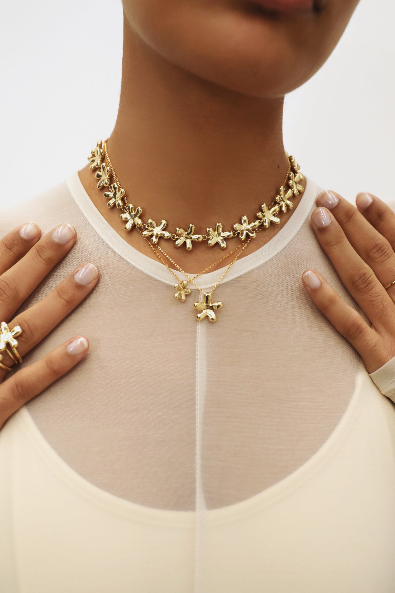The Daisy Chain Choker, cast in high-polished brass, brings together twenty-four handcrafted daisies, reimagining the whimsical daisy chain. Secured with a magnetised clasp.