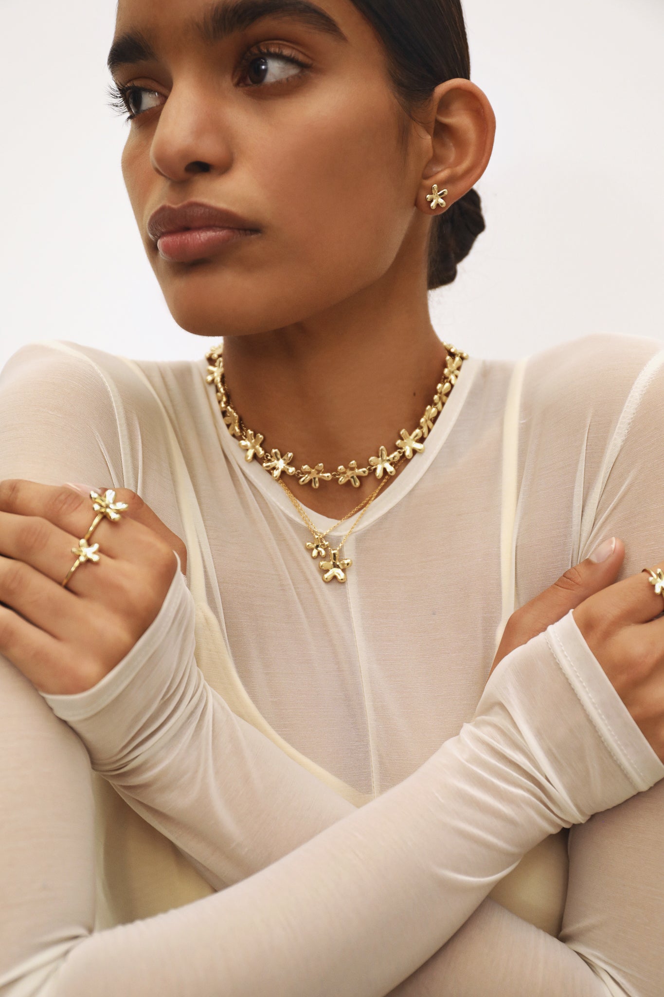 The Daisy Pendant showcases a daisy-shaped bead, in nano-coated brass. The daisy motif delicately threads a metal chain, with a DD logo tag at its tail end. Available in Nano-Coated Brass, and Silver-Plated Brass.
