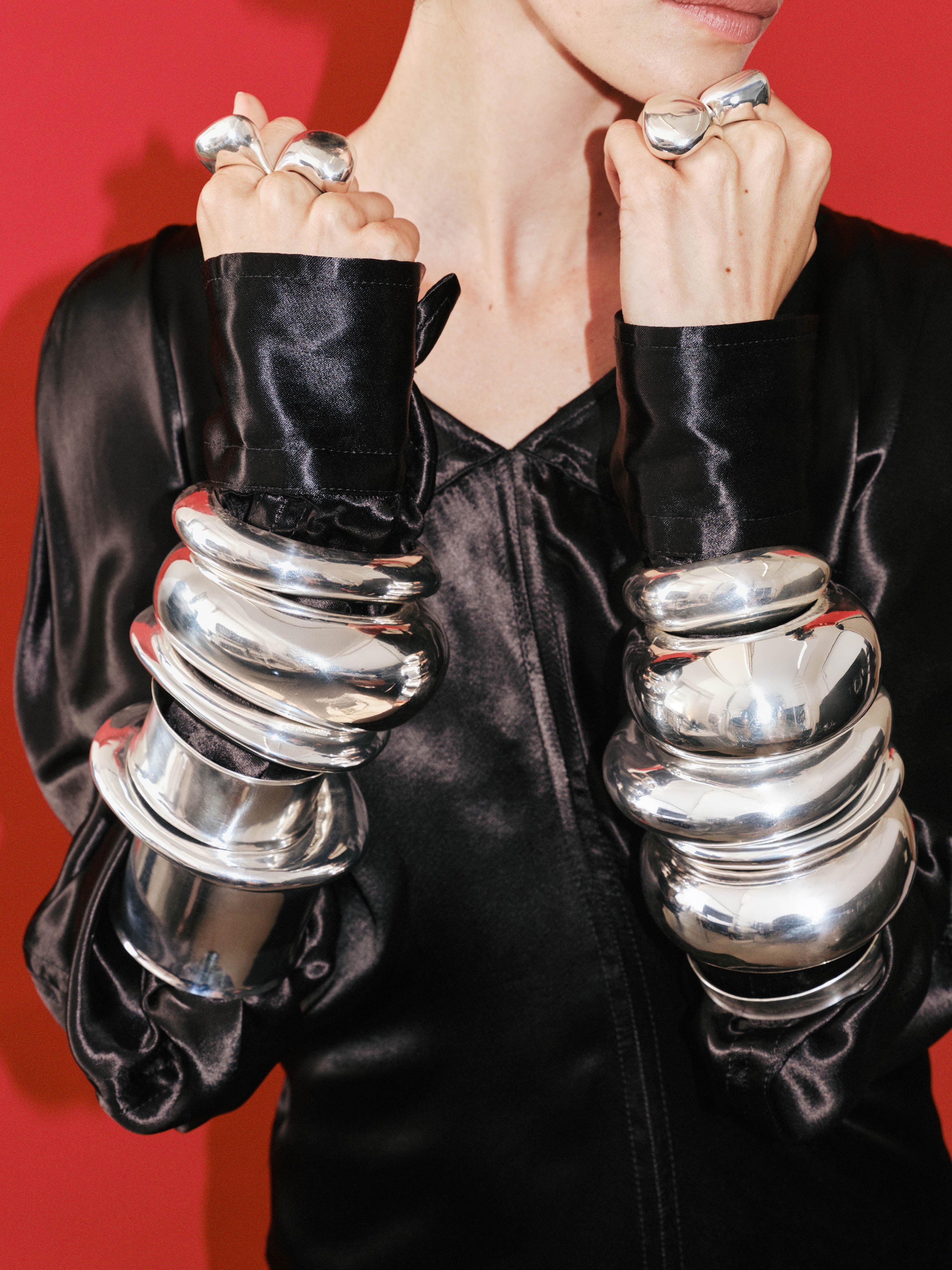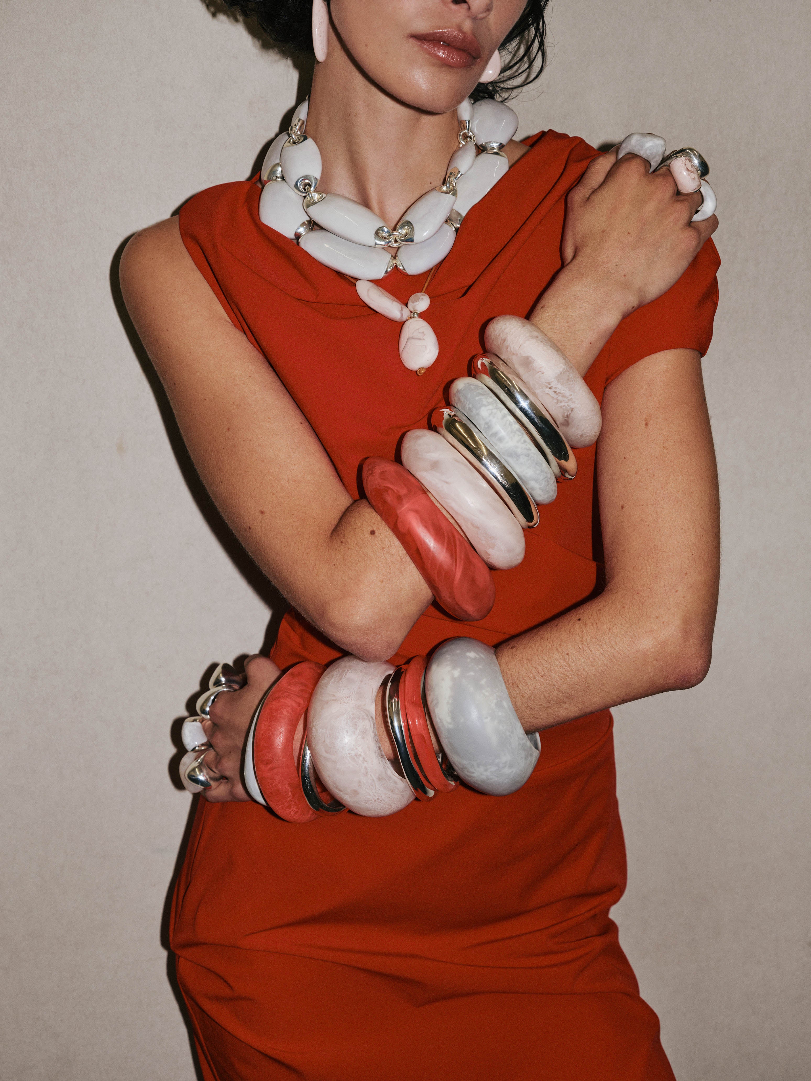 For jewellery, silver-fused resin beads in smooth, organic shapes feature across new beaded necklaces, chain and leather pendants and drop earrings, with the silver framing the colour and texture of the handmade resin. Drawing from the archive, a selection of archival Dinosaur Designs silver jewellery pieces have been reworked to celebrate the studio's enduring design legacy, established over the 40 years.