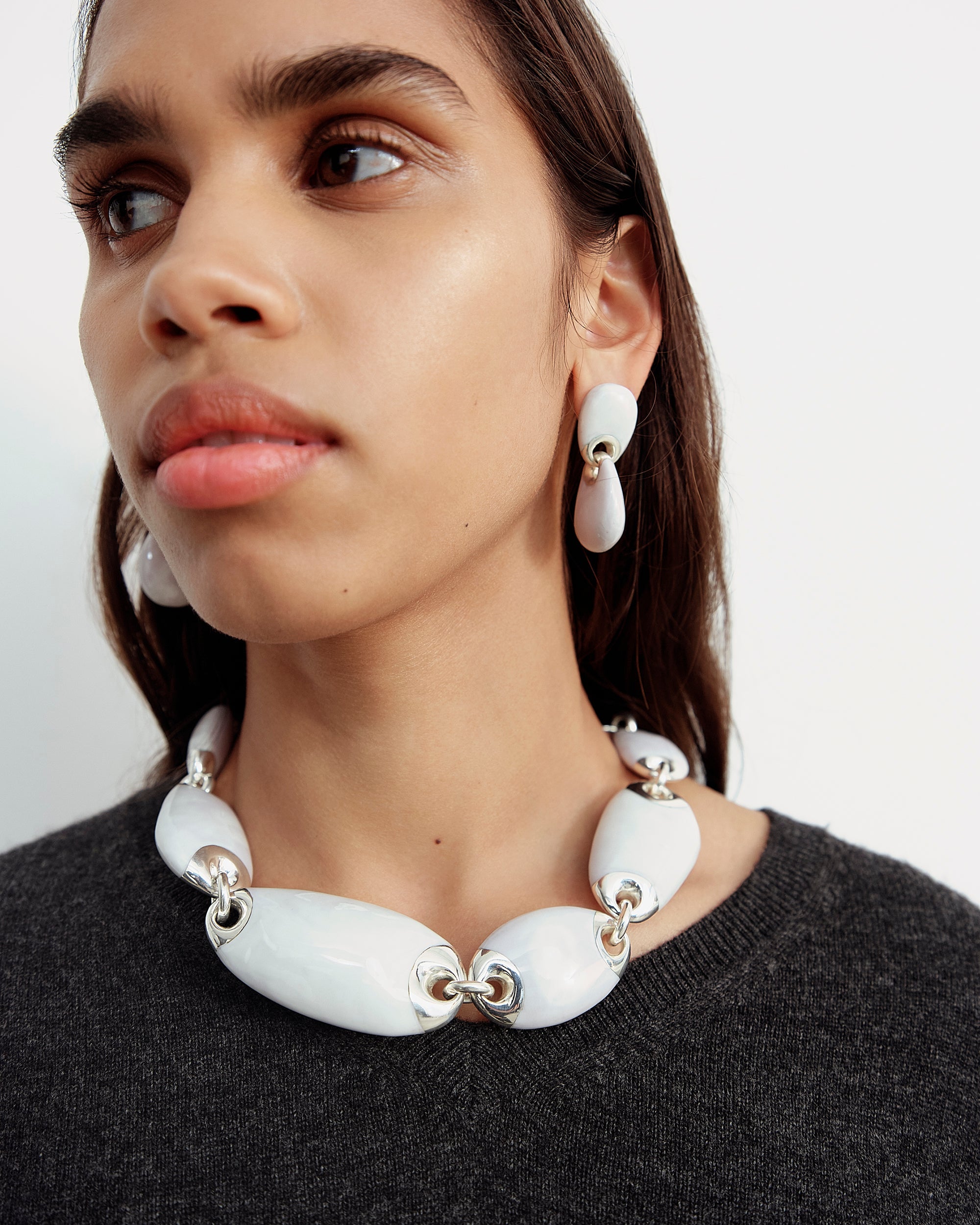 Referencing natural, geological forms, the Rock Choker skilfully links varied organic resin beads, creating a bold necklace style that sits at the collar. Each of resin bead is framed with silver ends, creating a chainlink detail as one bead connects to another.
