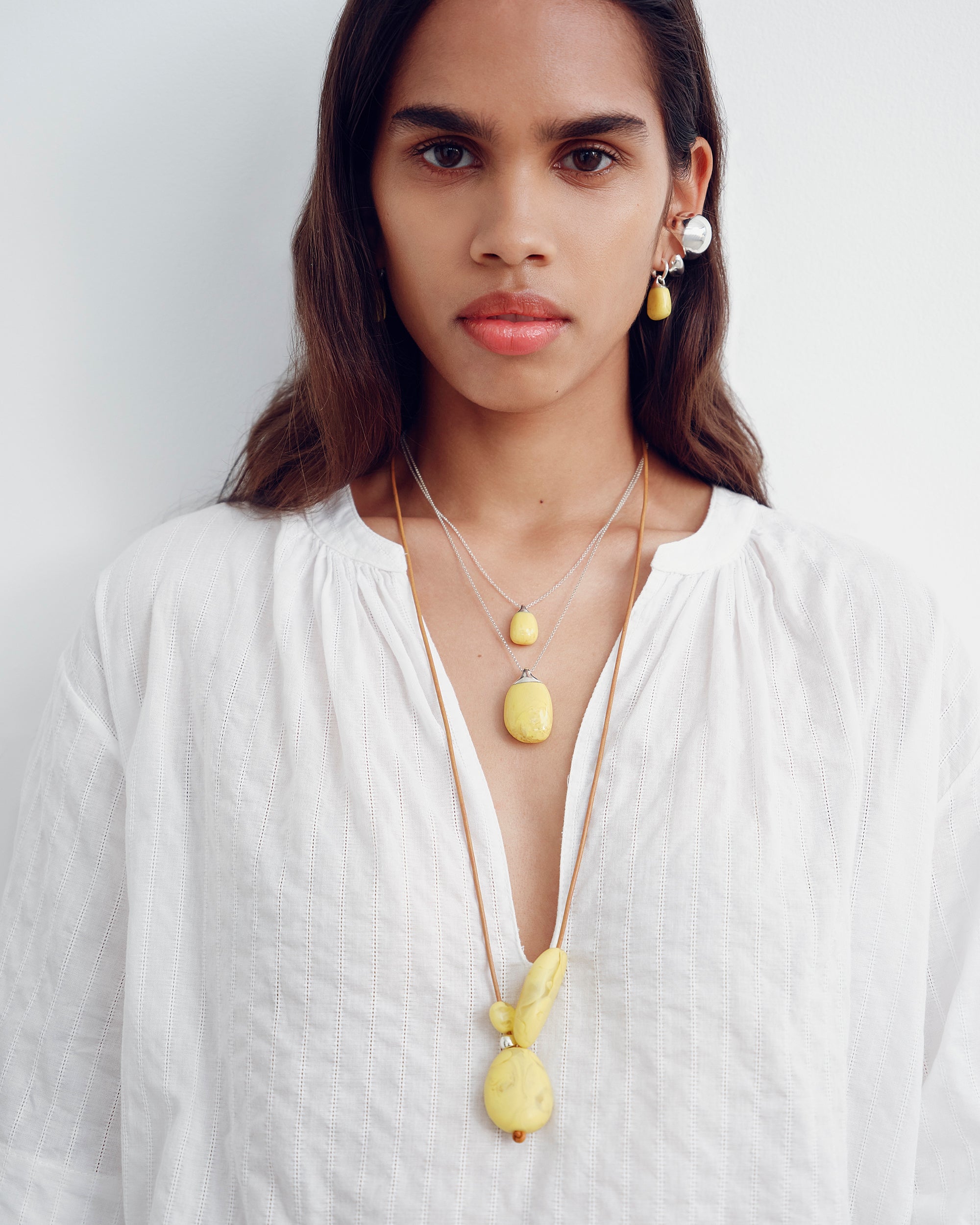Three smooth resin beads meet with a brass logo bead at the centre of this rock-inspired necklace. Threaded on a vegetable dyed leather cord, the Rock Cluster Pendant can be adjusted by securely knotting the cord to your ideal length.