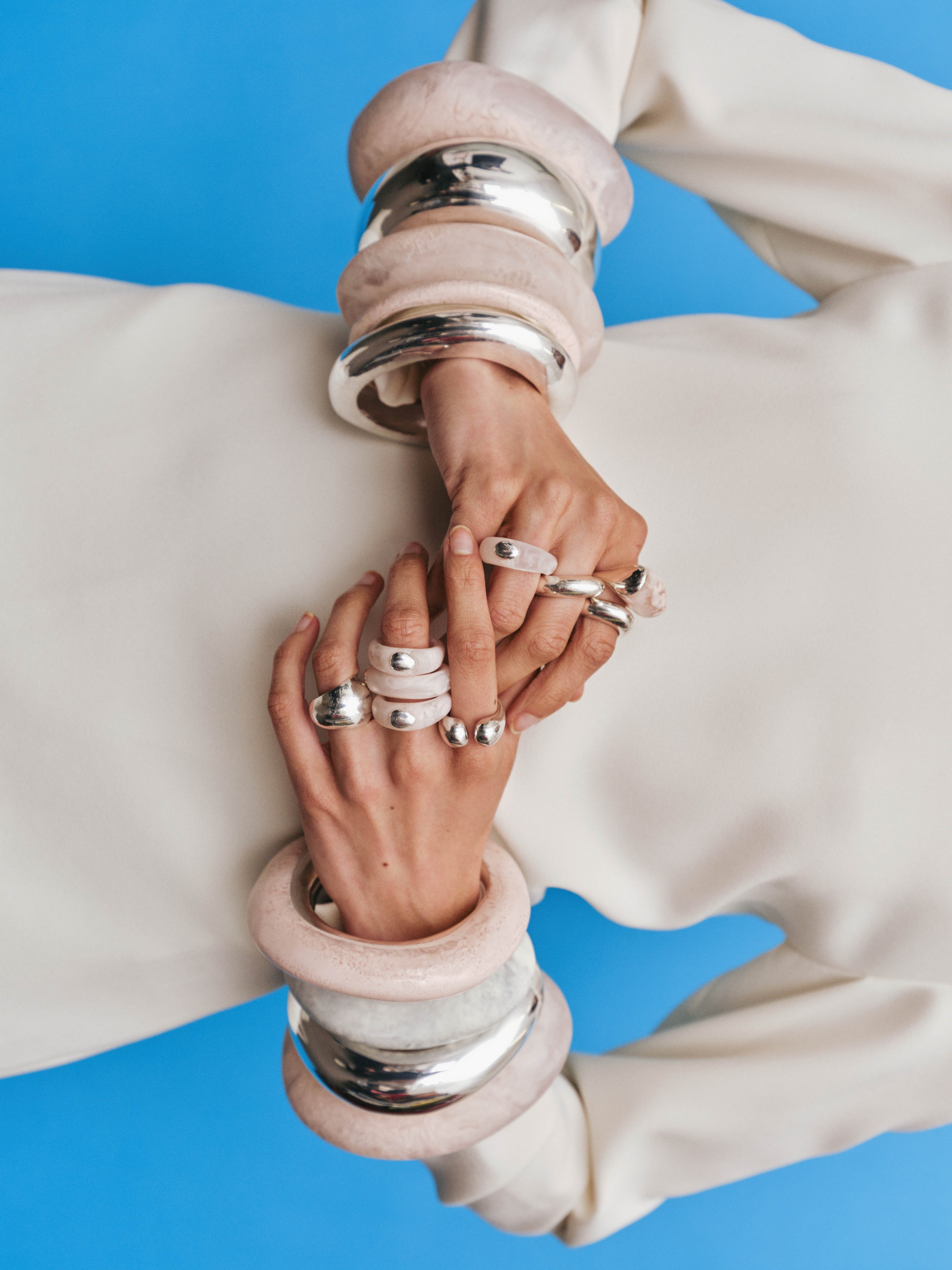 Our ring collection focuses on craftsmanship, rendering hand-modelled forms in richly-coloured resin. Open bands, organic forms feature throughout, and are contrasted with accents of brass, gold and silver, for a reflective and textural effect.