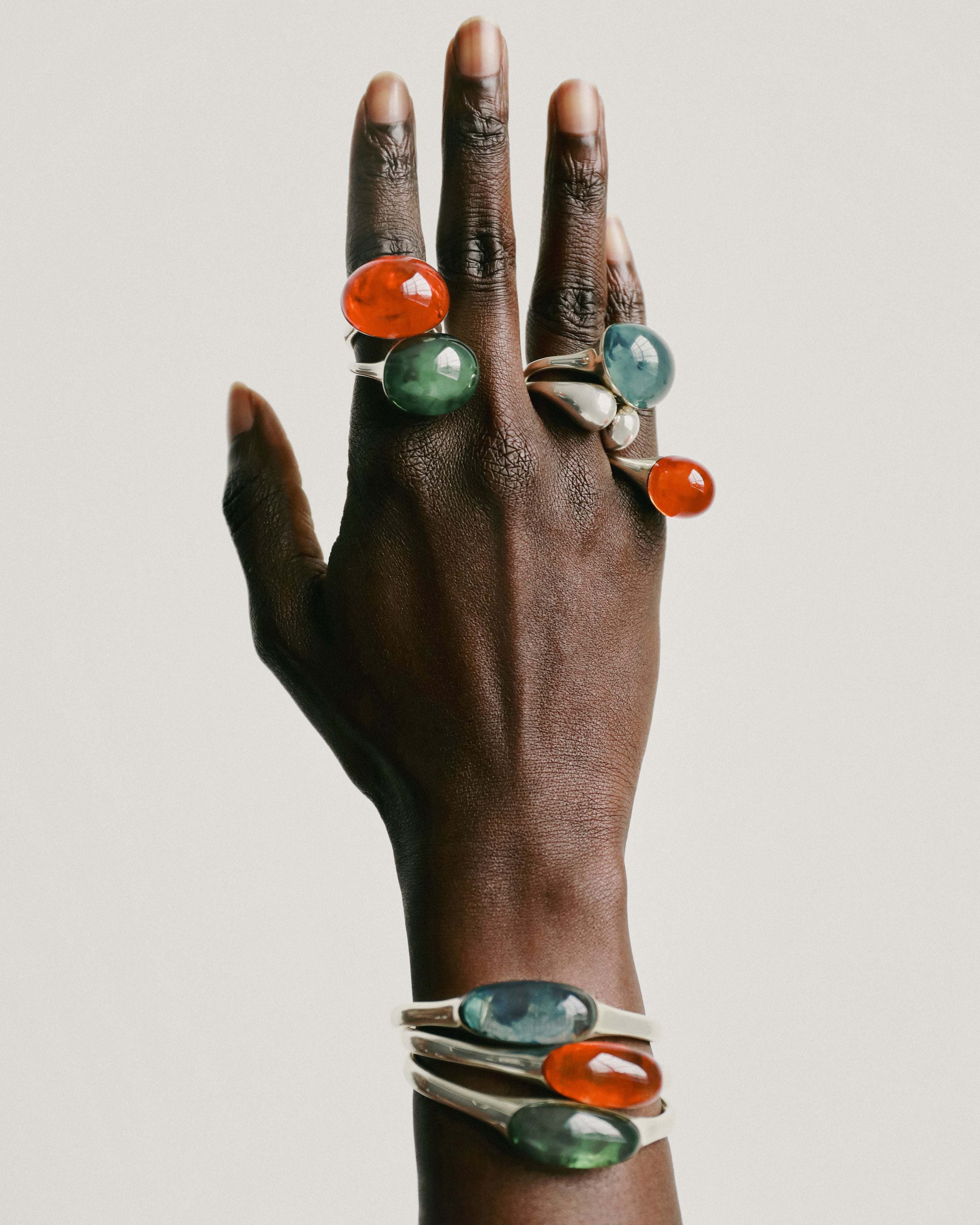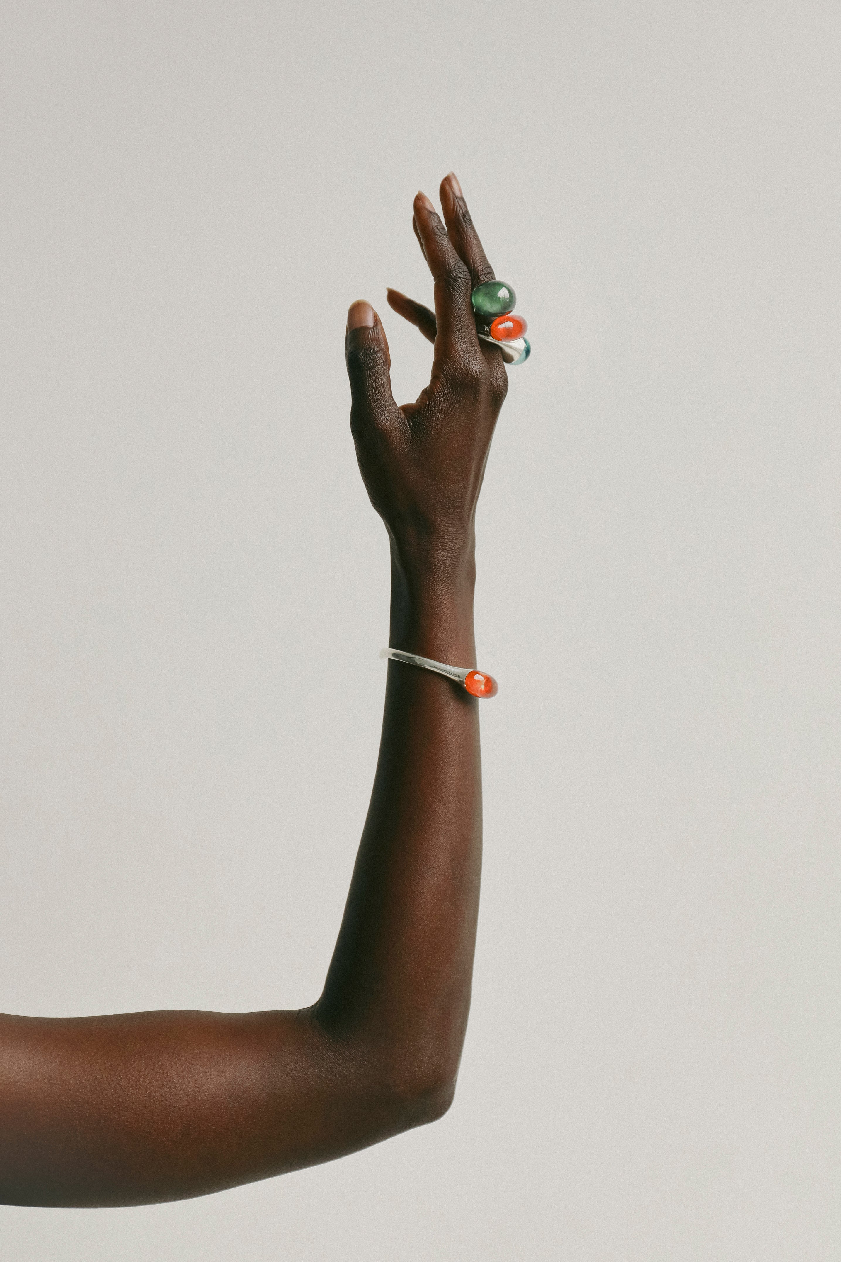The Watercolour Cuff is an evolution of our archival resin inlay styles. Calling upon the liquid nature of resin and metal, the resin swirls of the Watercolour Cuff resemble water droplets with a refined, glass-like quality. The surface finish is the result of meticulous hand-polishing, enhanced by its sleek metal body. The cuff embraces the wrist for a secure and comfortable fit.