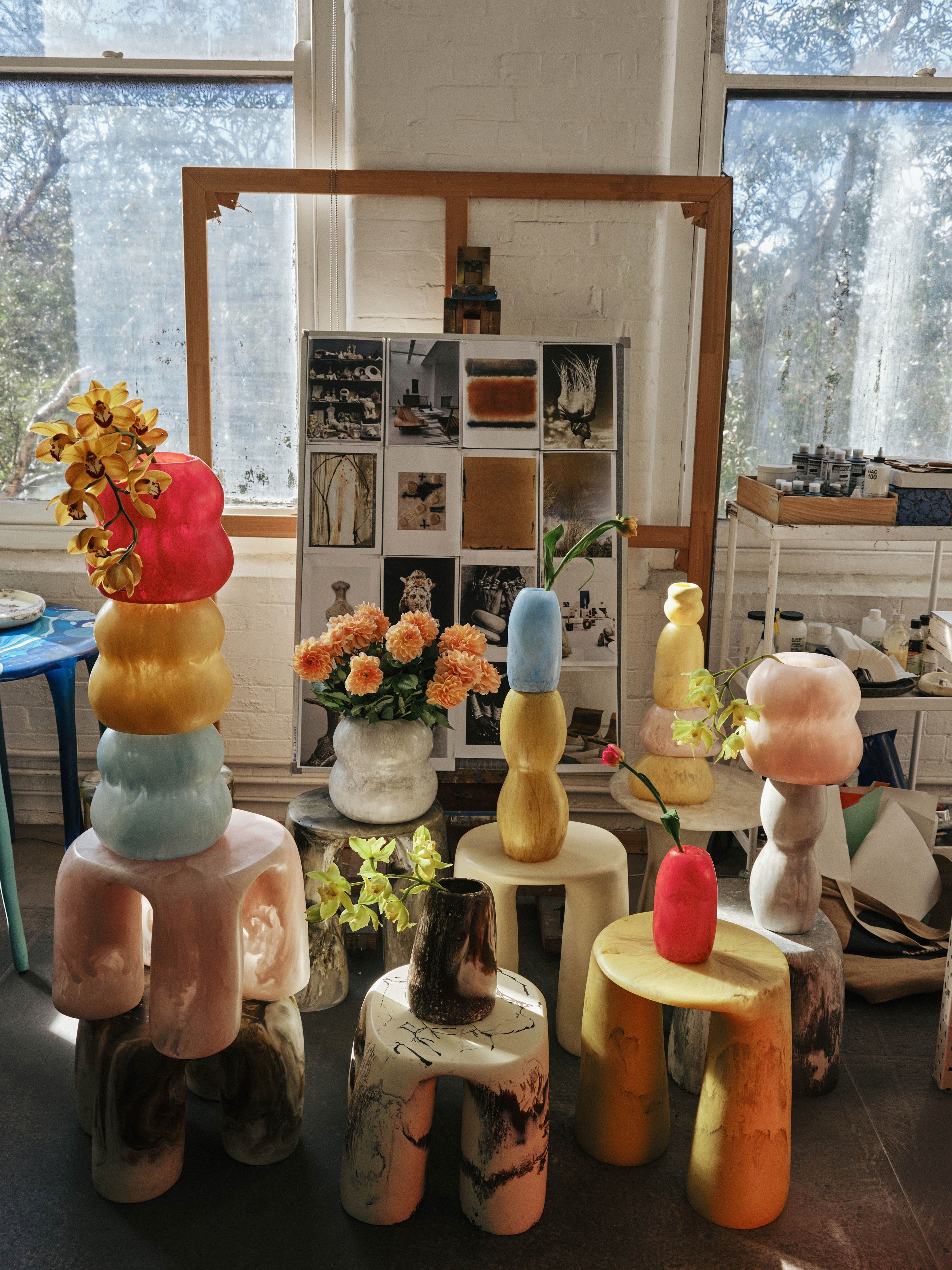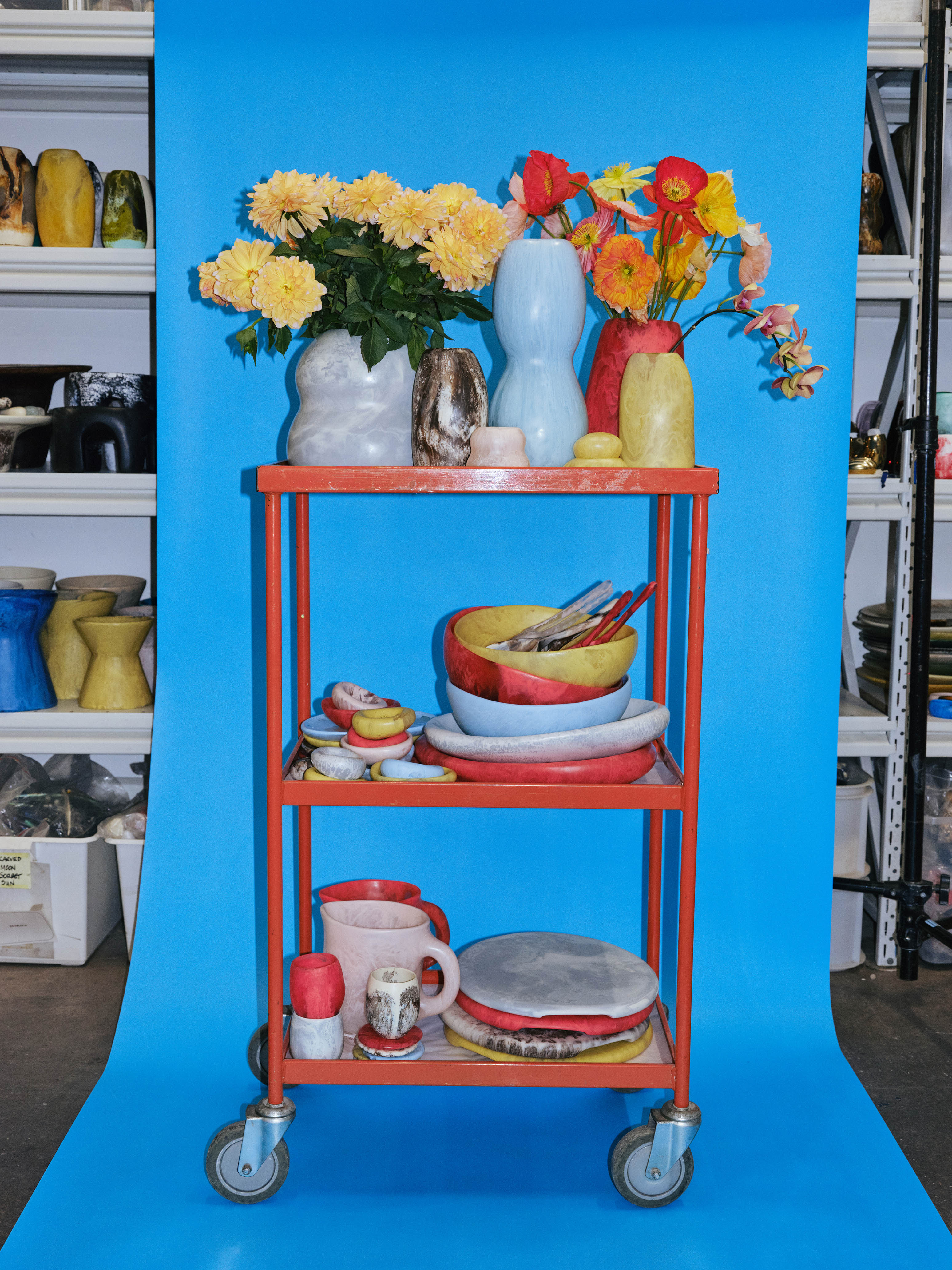 For jewellery, silver-fused resin beads in smooth, organic shapes feature across new beaded necklaces, chain and leather pendants and drop earrings, with the silver framing the colour and texture of the handmade resin. Drawing from the archive, a selection of archival Dinosaur Designs silver jewellery pieces have been reworked to celebrate the studio's enduring design legacy, established over the 40 years.